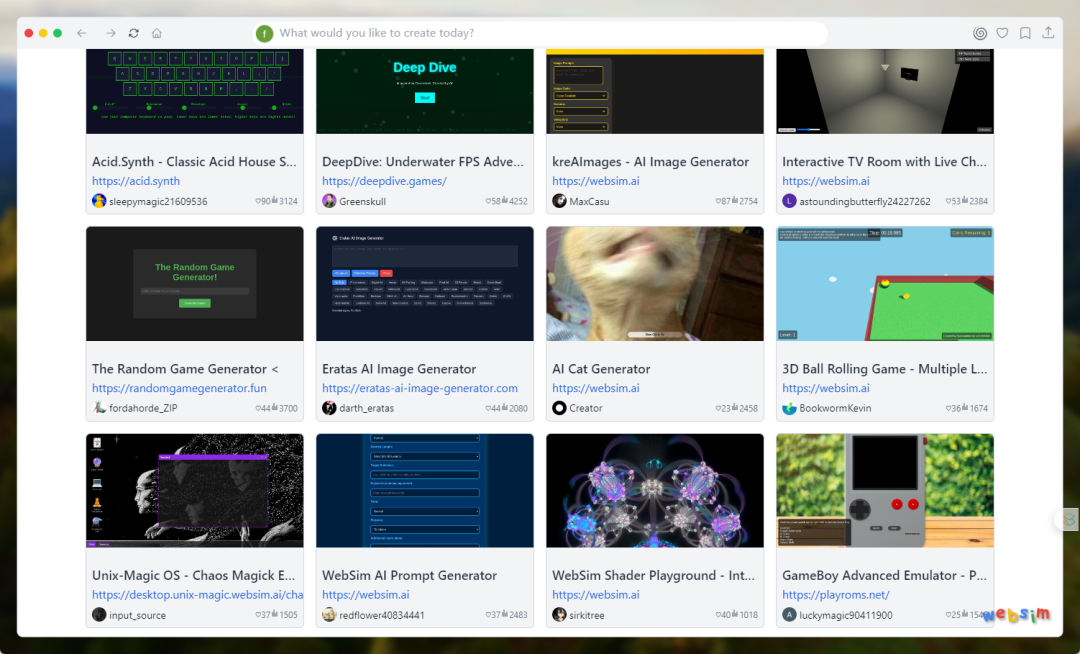 而这还只是Websim.ai最最基础的功能,它的主页还有很多用户分享的用Websim.ai做出来的各种奇思妙想的网页。