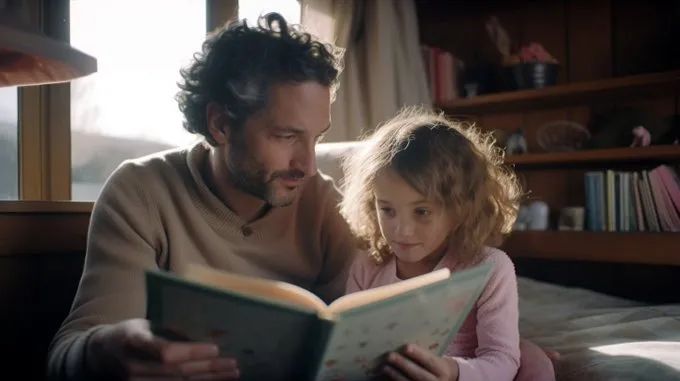 电影,偏心,双镜头,35毫米胶片剧照,一个30岁的法国男人,卷曲的棕色头发和一件染色的米色polo衫,给他可爱的5岁女儿读书,穿着模糊的粉红色睡衣,坐在舒适的角落角落,阳光明媚的自然采光,阳光透过窗户的玻璃照射,温暖的晨光,清晰的焦点, 天上的光照,无条件的爱--ar 16:9