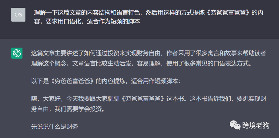 然后我们把这些内容喂给Chatgpt,让他理解这篇文章的内容结构,按照这篇文章的结构生成我们想要的视频脚本