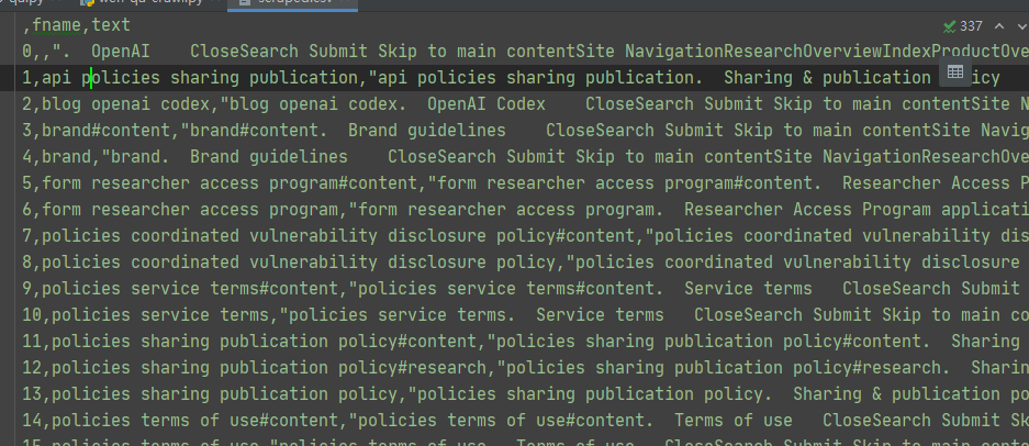 #Step 5 删除text多余间距def remove_newlines(serie): serie = serie.str.replace('\n', ' ') serie = serie.str.replace('\\n', ' ') serie = serie.str.replace(' ', ' ') serie = serie.str.replace(' ', ' ') return serie### Step 6 text数据通过df.to_csv()转为csvtexts = []# 获取文本目录中的所有文本文件for file in os.listdir("text/" + domain + "/"): with open("text/" + domain + "/" + file, "r", encoding="UTF-8") as f: text = f.read() # 省略前11行和后4行,然后用空格替换-、_和#update. texts.append((file[11:-4].replace('-', ' ').replace('_', ' ').replace('#update', ''), text))# 从文本列表创建一个数据框架df = pd.DataFrame(texts, columns=['fname', 'text'])df['text'] = df.fname + ". " + remove_newlines(df.text)df.to_csv('processed/scraped.csv')df.head()