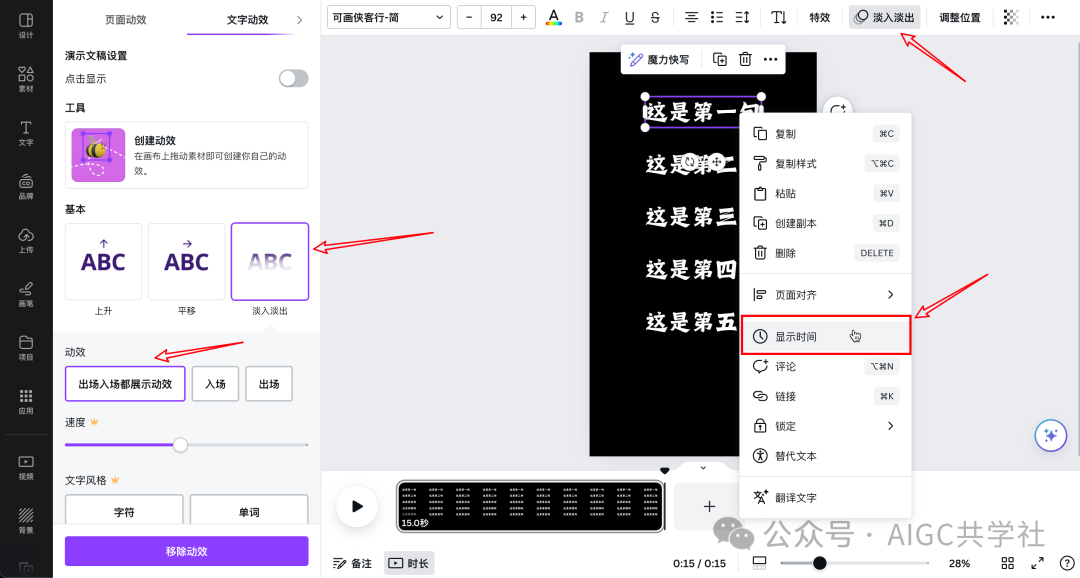文字还可以设置动效,比如给每句话增加一个淡入淡出的效果。