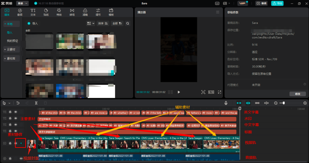刚开始做剪辑会比较耗时,因为素材积累不够。等素材积累的多了,半个小时左右就能剪一条视频,注意视频轨的素材要静音。