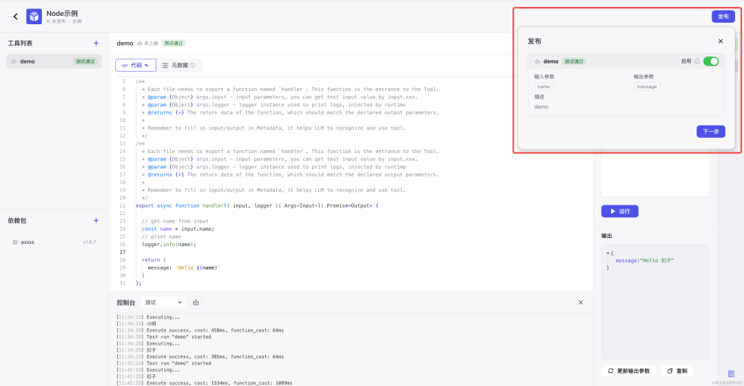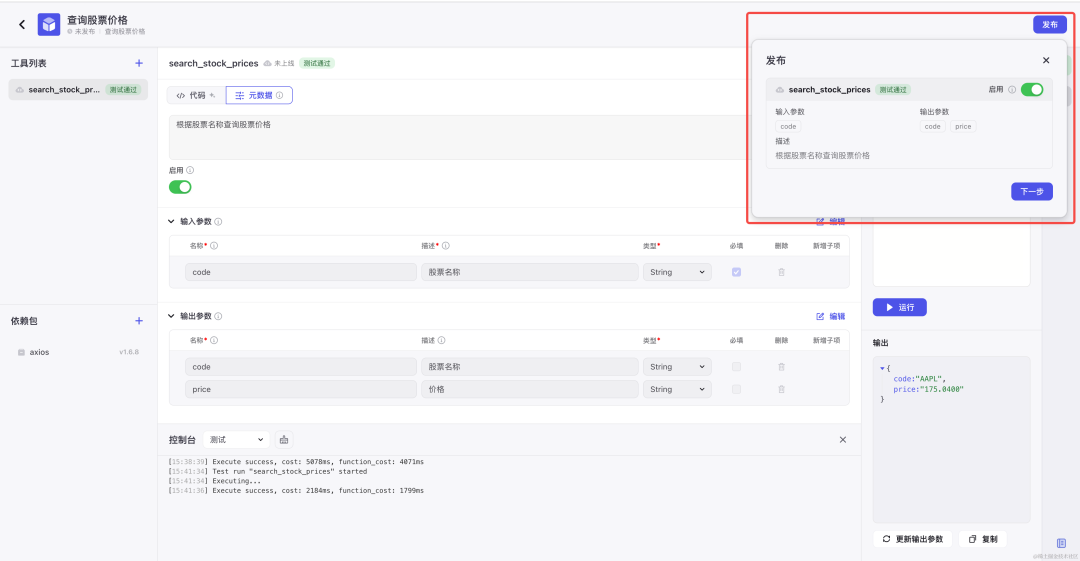 测试通过后,就可以去点击发布啦。如果你开发了多个工具,但有些没测试完成不想发布,可以在该入口禁用这些工具,只发布启用的工具。