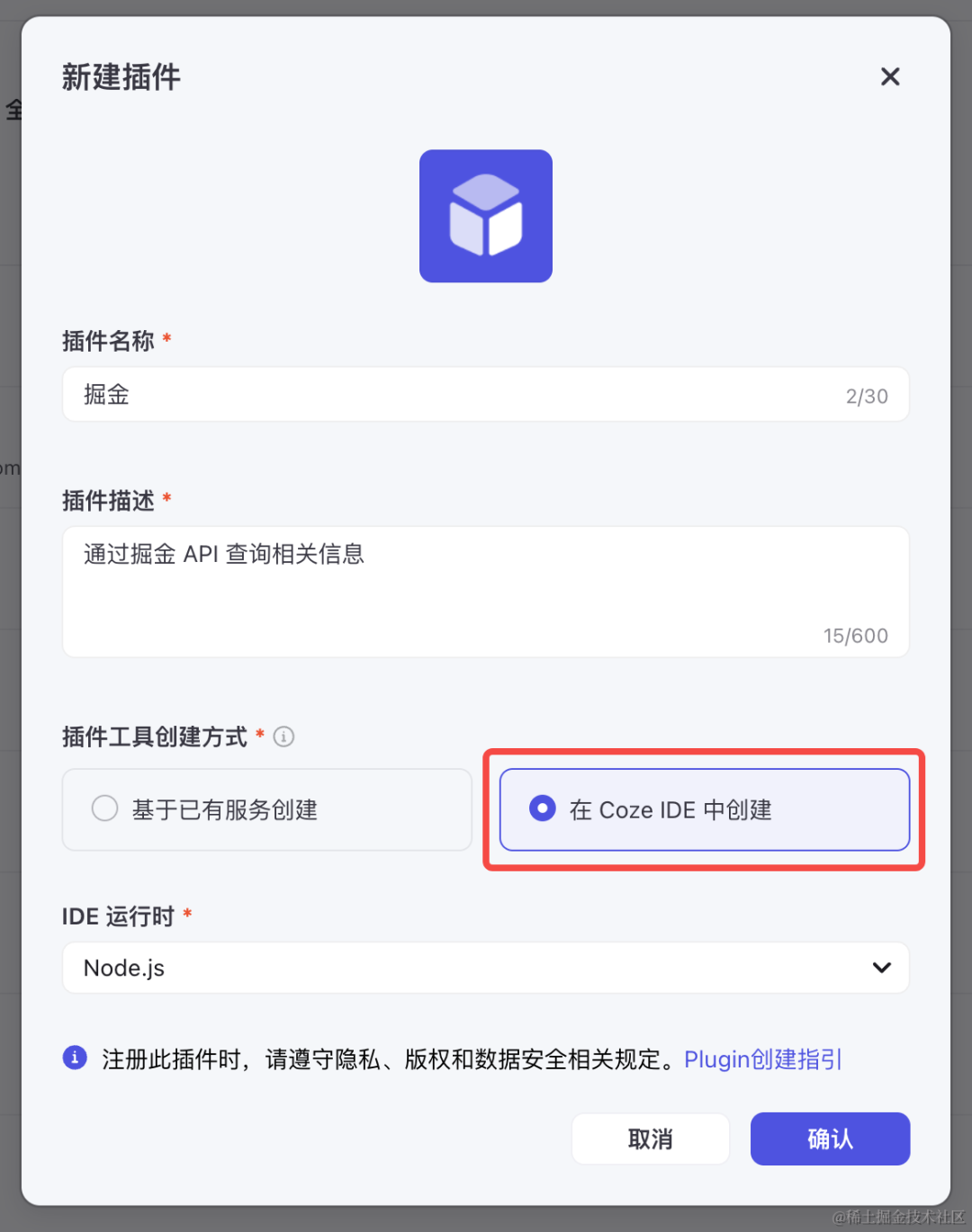 点击右上角创建插件,填写名称,选择插件创建方式为“在 Coze IDE 创建”,运行时选择“Node.js”(你也可以根据自己的情况,选择 Python)