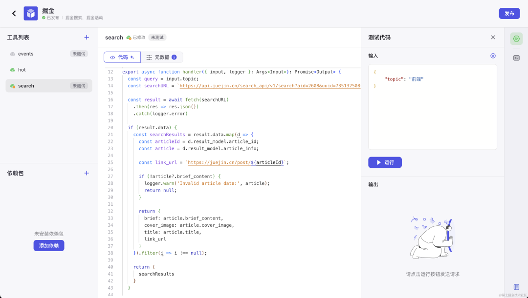 写完代码和元数据后,需要验证代码是否正常运行。点击右侧的测试,输入测试的数据。
