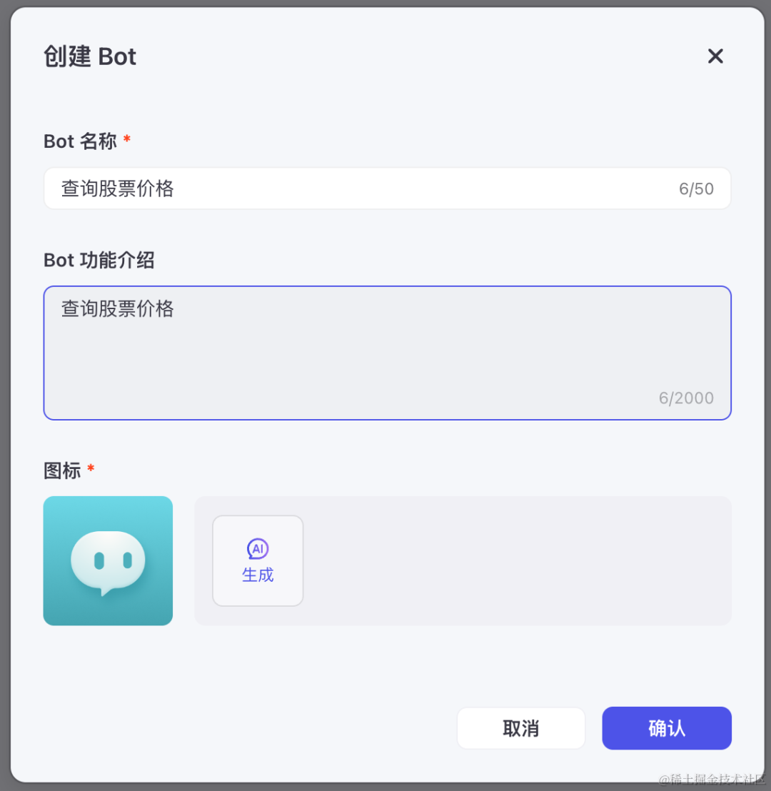 回到 Bot 列表,点击创建 Bot,填写名称和功能描述: