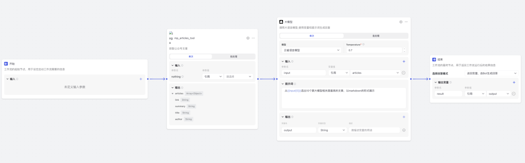 回到个人空间,点击工作流标签,点击创建工作流,填写相关信息,进入工作流的编排页面,选择刚才创建的插件,选择刚才创建的工具,点击添加。按照如图所示的流程进行编排,这样就可以让AI来进行筛选,得到最符合你要求的目标文章了,我写的提示词比较简单,大家可以进一步的优化一下提示词,这个很重要,但是我感觉者就可以满足我的要求了,所以我就直接使用了。