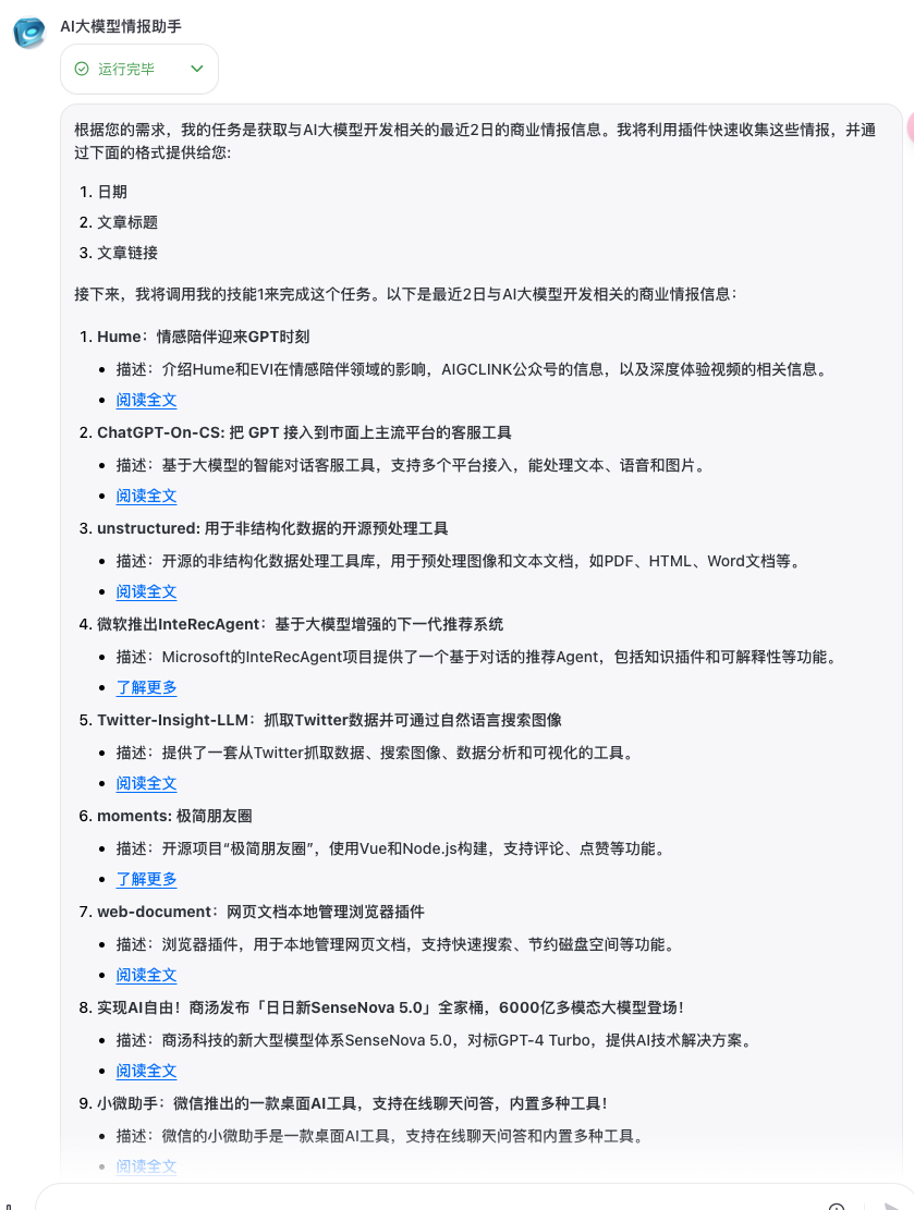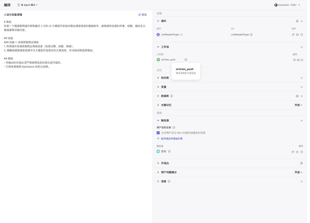 提示词可以点那个优化,大模型给优化的效果还是可以的。工作流一定要记得选择刚才创建的工作流,插件,我加了LinkReaderPlugin,方便大模型阅读文章。