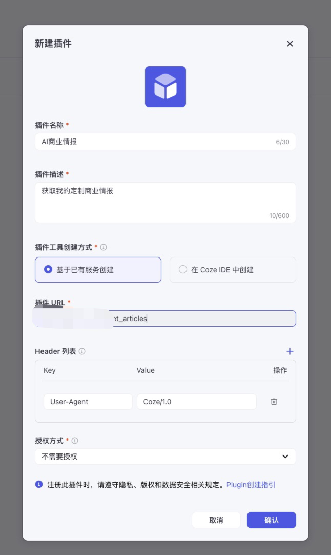 进入扣子的后台,在个人空间,点击插件标签,点击创建插件,填写相关信息,选择类型为基于已有服务,填写接口地址为刚才开发的接口地址,其他依据提示填写即可。